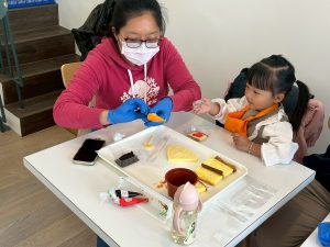家長與孩子一同用金格長崎蛋糕與糖霜等材料,層層堆疊出「小盆栽🌱」,陪伴孩子增進親子關係。